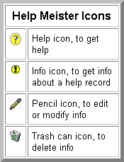 These are frame-based pages. The large page panel on the bottom-right is the body of the Help Manual. It lists the help records with the icons (top-right picture) to the right of each help title. The info icon (asterisk in circle) brings up the view that users get in Help Meister's pop-up window. The pencil and trash can icons (sys admin only) brings up the form to edit the help record or the confirmation to delete it.
